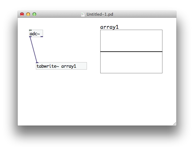 ここで一つだけ変更を加えます。array1のサイズを44100から1764に変更します。これが何を意味するかと言うと、サンプリング周波数 = 1秒間のデータの数だったので、グラフの横軸を1764 / 44100 = 0.04 秒に変更したことになります。サンプリング周波数 × 時間 = データ点数、時間 = データ点数 / サンプリング周期という関係を覚えておくと計算が簡単です。男声の基本周波数が125 Hz(周期 1 / 125 = 0.008 s)くらいなので、これくらいのグラフのサイズの方が波形の変化を見やすくなります。さてこの状態からあと二つパーツを加えます。